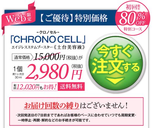 現在、「クロノセル」は通常価格より12,020円割引の2,980円で試せる特大SALE開催中!