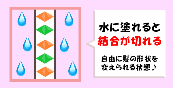 水素結合は水分に接すると結合が切れて、乾くと再結合します。。←寝癖を直す時に髪を濡らすと真っ直ぐになる理由がコレ!