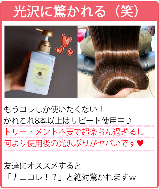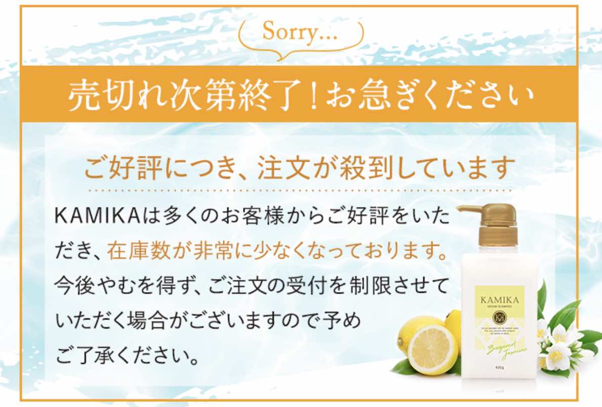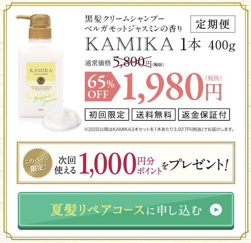 | KAMIKA | 髪に嬉しい成分をたっぷり配合した泡立たないクリームシャンプー。 | 1980円 | 11800円 | あり | なし | 商品詳細はこちら |